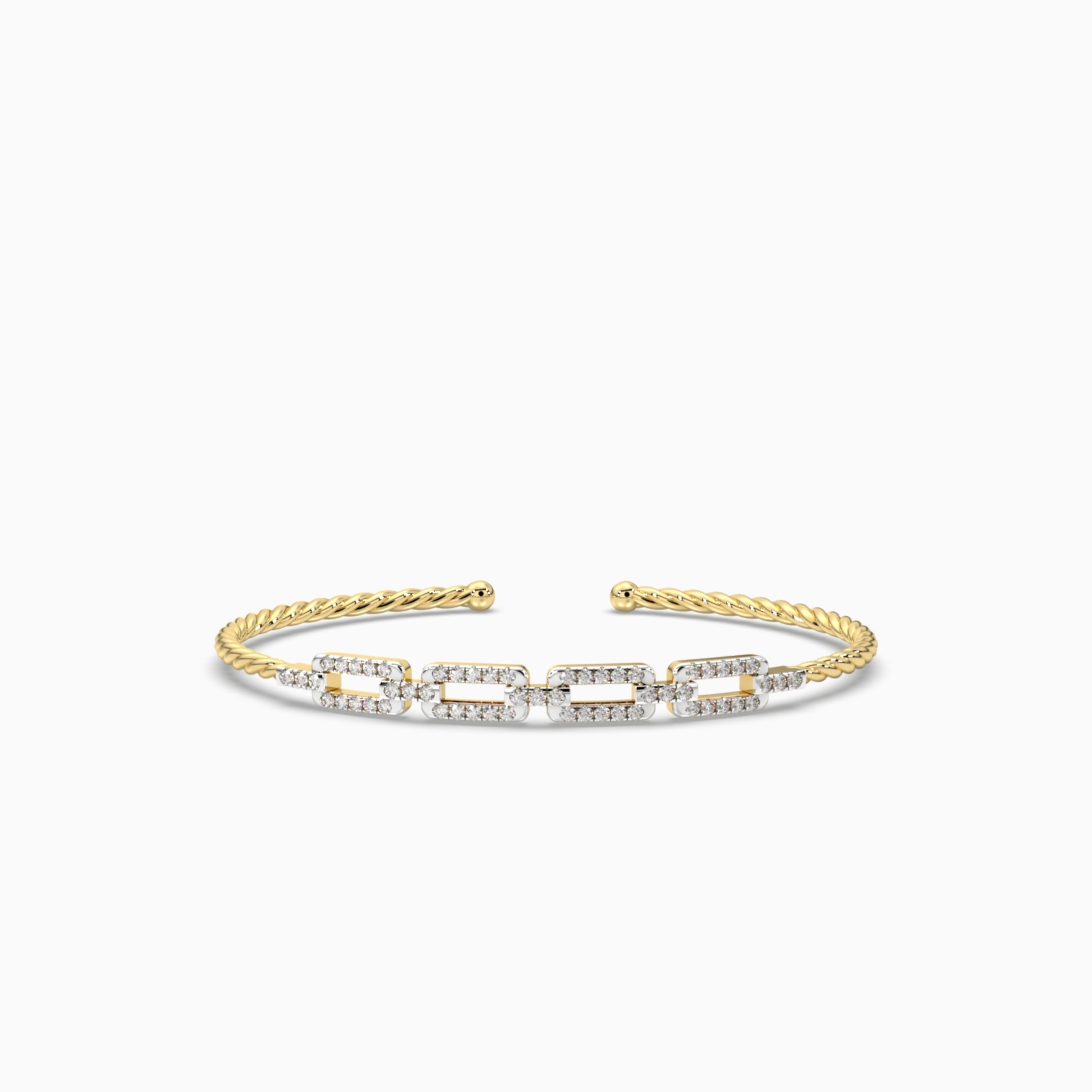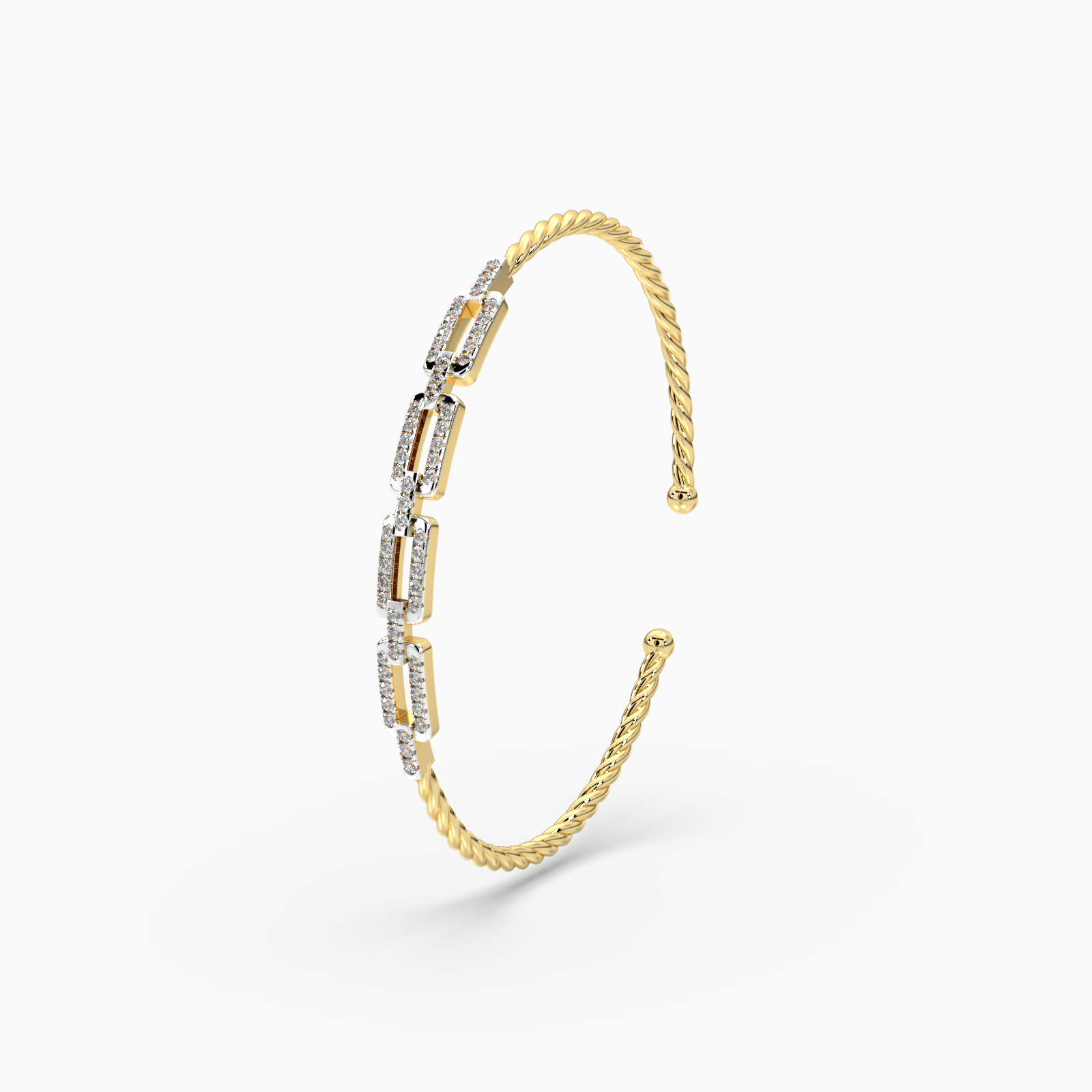 The interlocking rectangular triple excellent cut diamond clusters, accented with delicate metal borders, evoke a sense of harmony and grace. Its open cuff design, with its twisted band, offers both flexibility and style, making it perfect for layering or wearing solo. Designed for the confident, stylish woman, this bracelet serves as a subtle statement of sophistication, ideal for everyday wear or special occasions, and a thoughtful gift to celebrate moments of elegance.