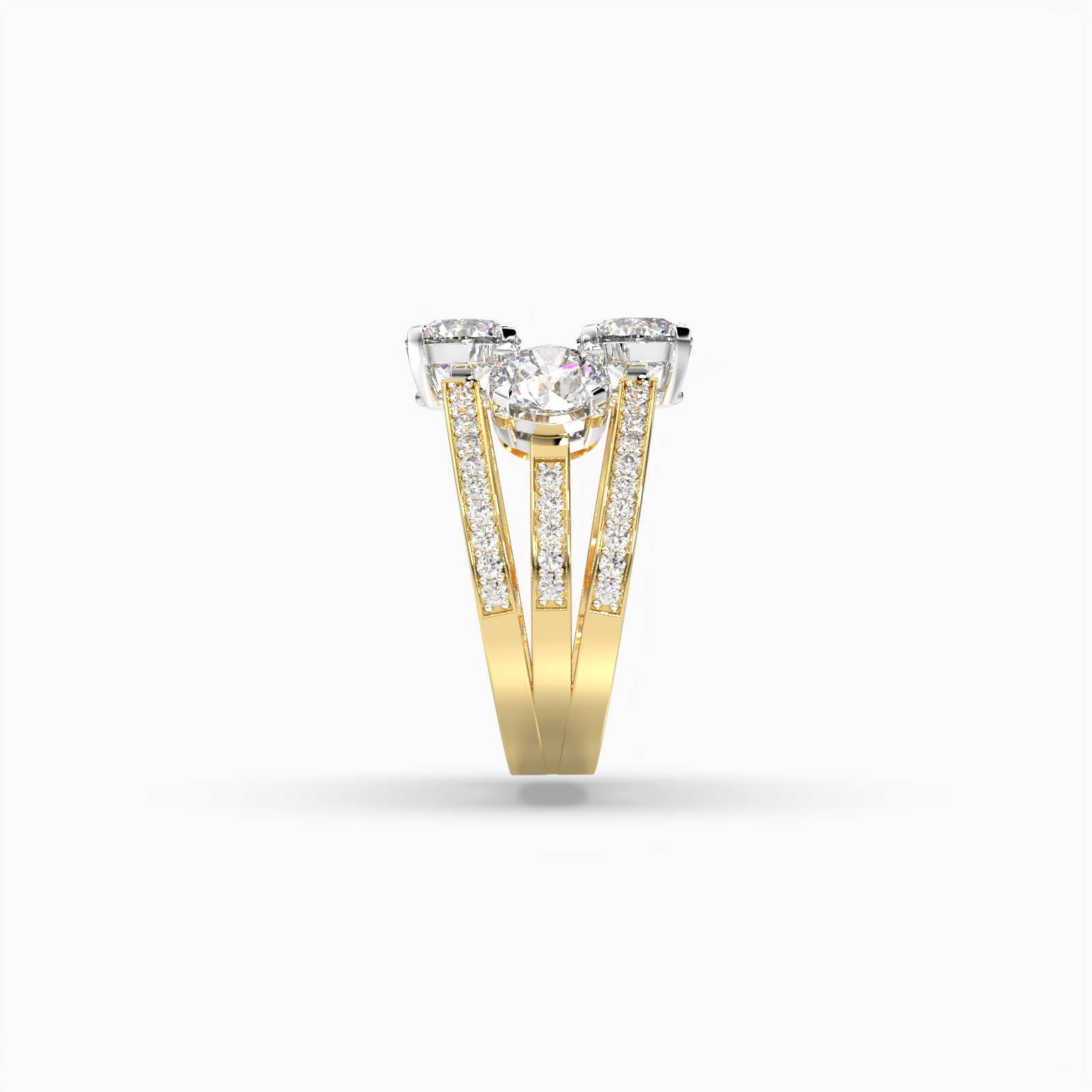Four luminous diamonds orbit a sleek baguette accent, framed by pavé-set bands in 14kt gold. Architectural yet fluid, its design balances structure with radiance—an ode to modern opulence, where every angle captures light with effortless allure.