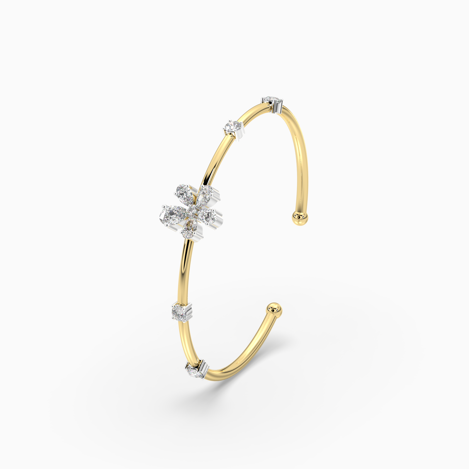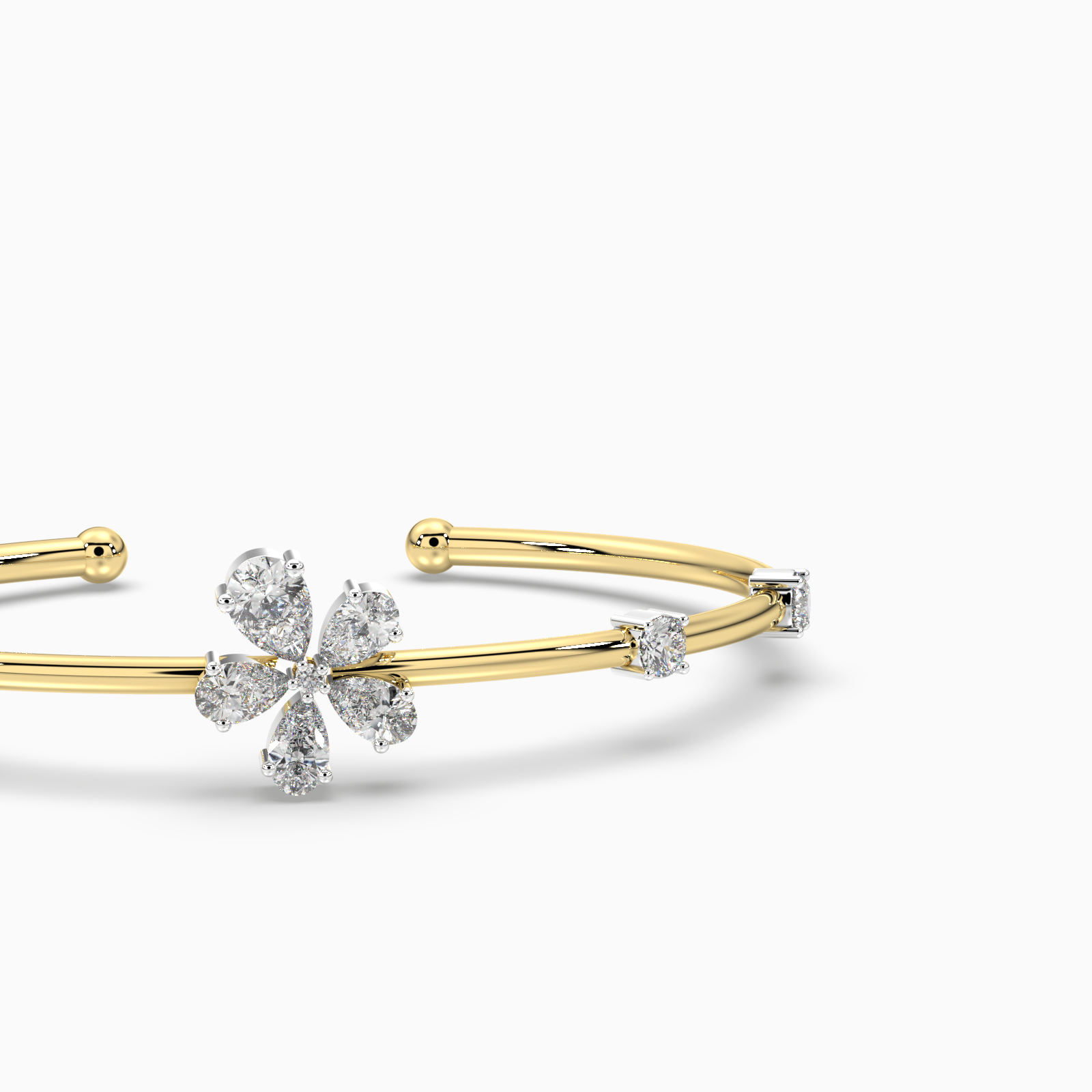 Set in 14kt gold, the bracelet features a stunning diamond flower, crafted from pear-shaped diamonds that capture light with every movement. A symbol of beauty and growth, the piece is designed to be worn with grace and sophistication. Perfect for the elegant woman, this gold bracelet is ideal for special moments or everyday wear, making it a thoughtful gift for those who appreciate refined, emotional pieces.