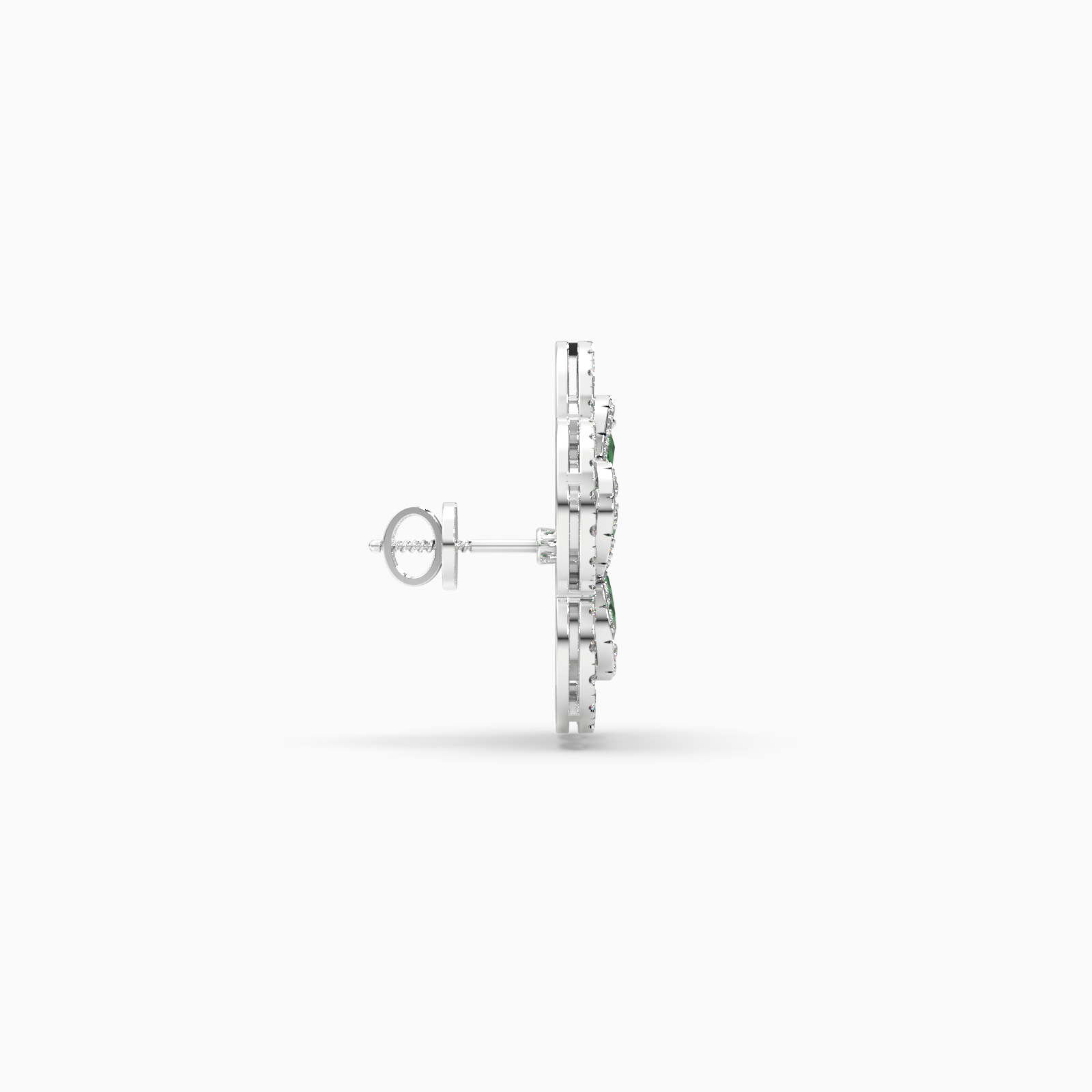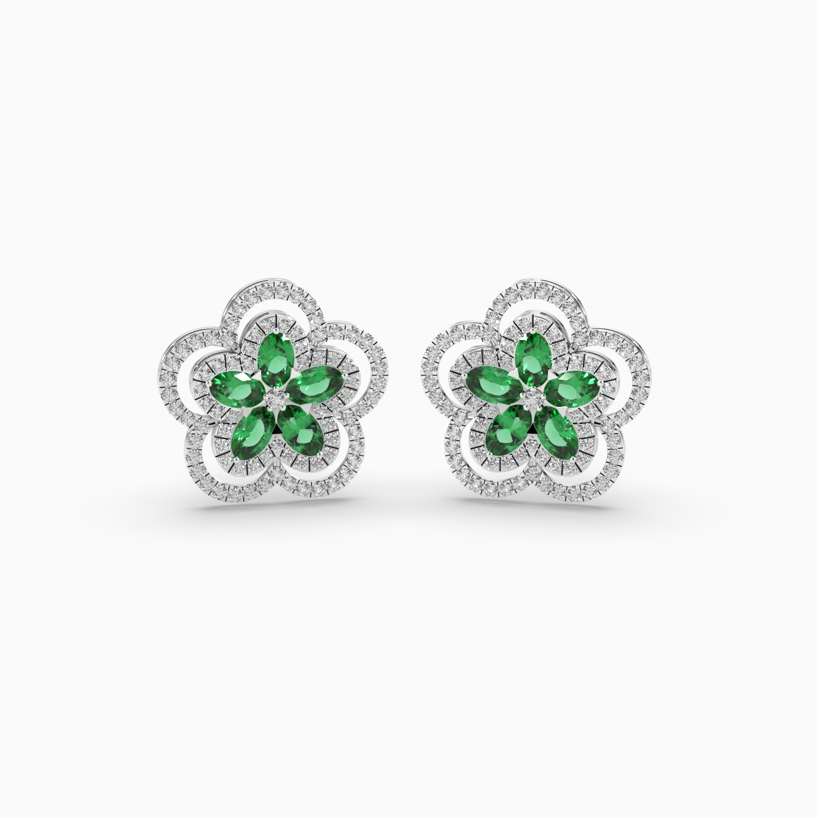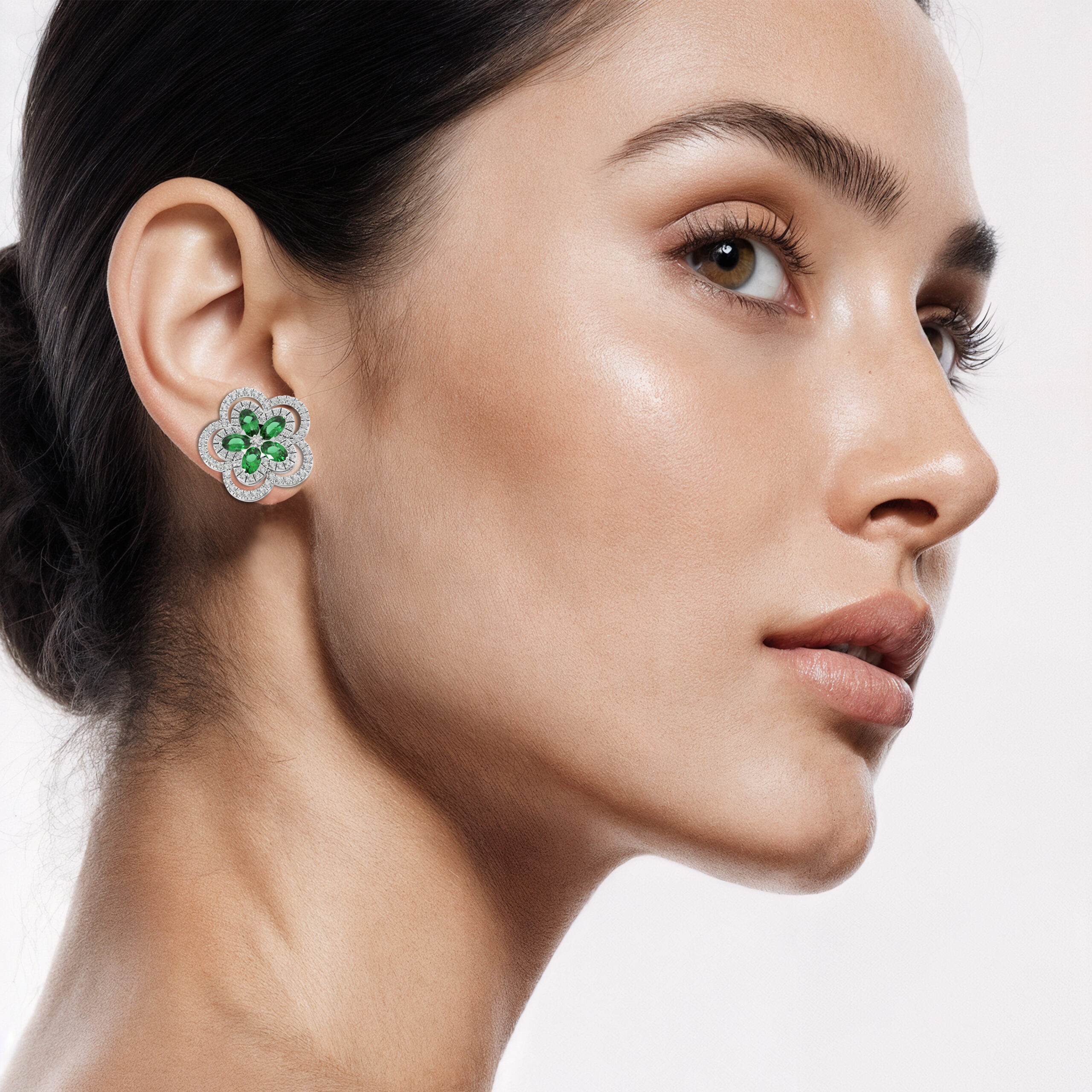 Set in 14kt white gold, the design features vibrant green gemstones, nestled within a halo of radiant diamonds, echoing the delicate structure of a blossoming flower. Crafted to celebrate life’s precious moments, these earrings blend elegance and strength, elevating both everyday rituals and meaningful milestones with their exquisite balance of color, light, and luxury.