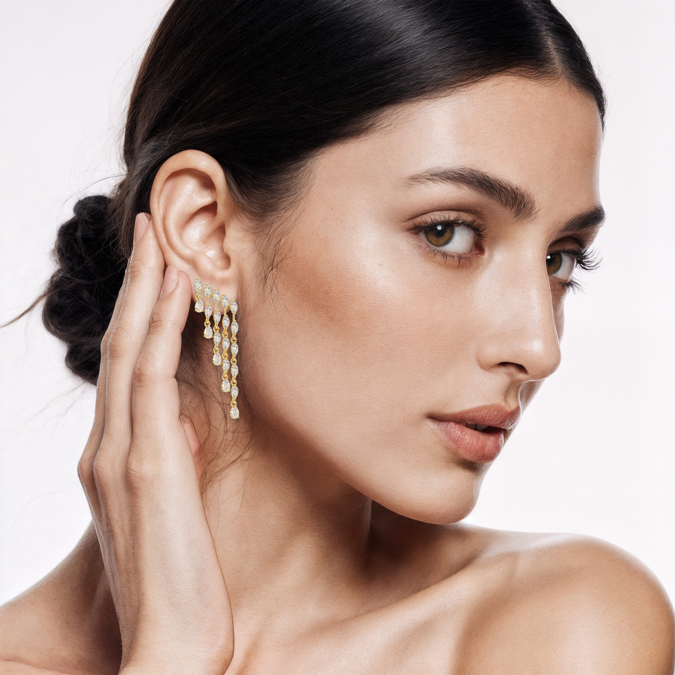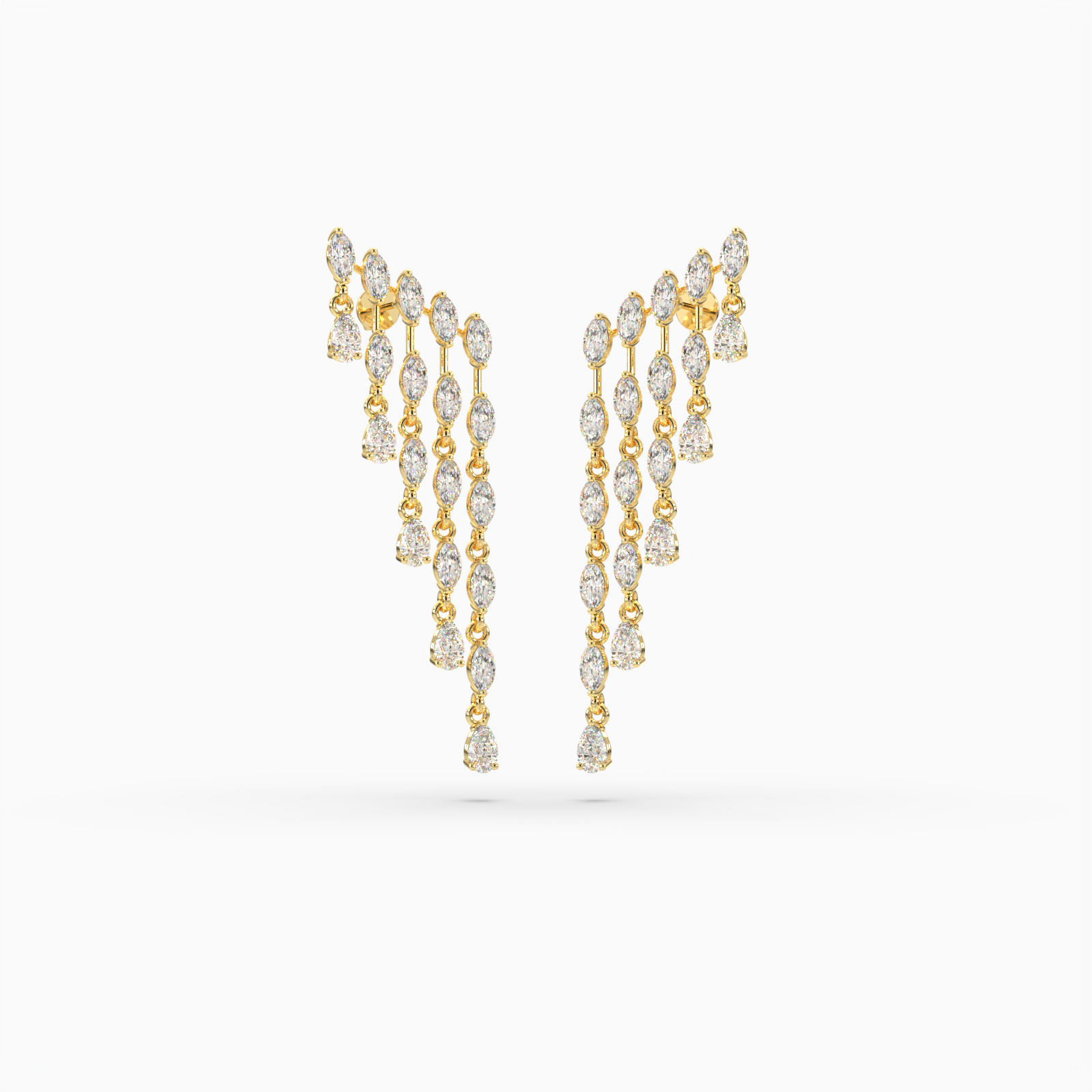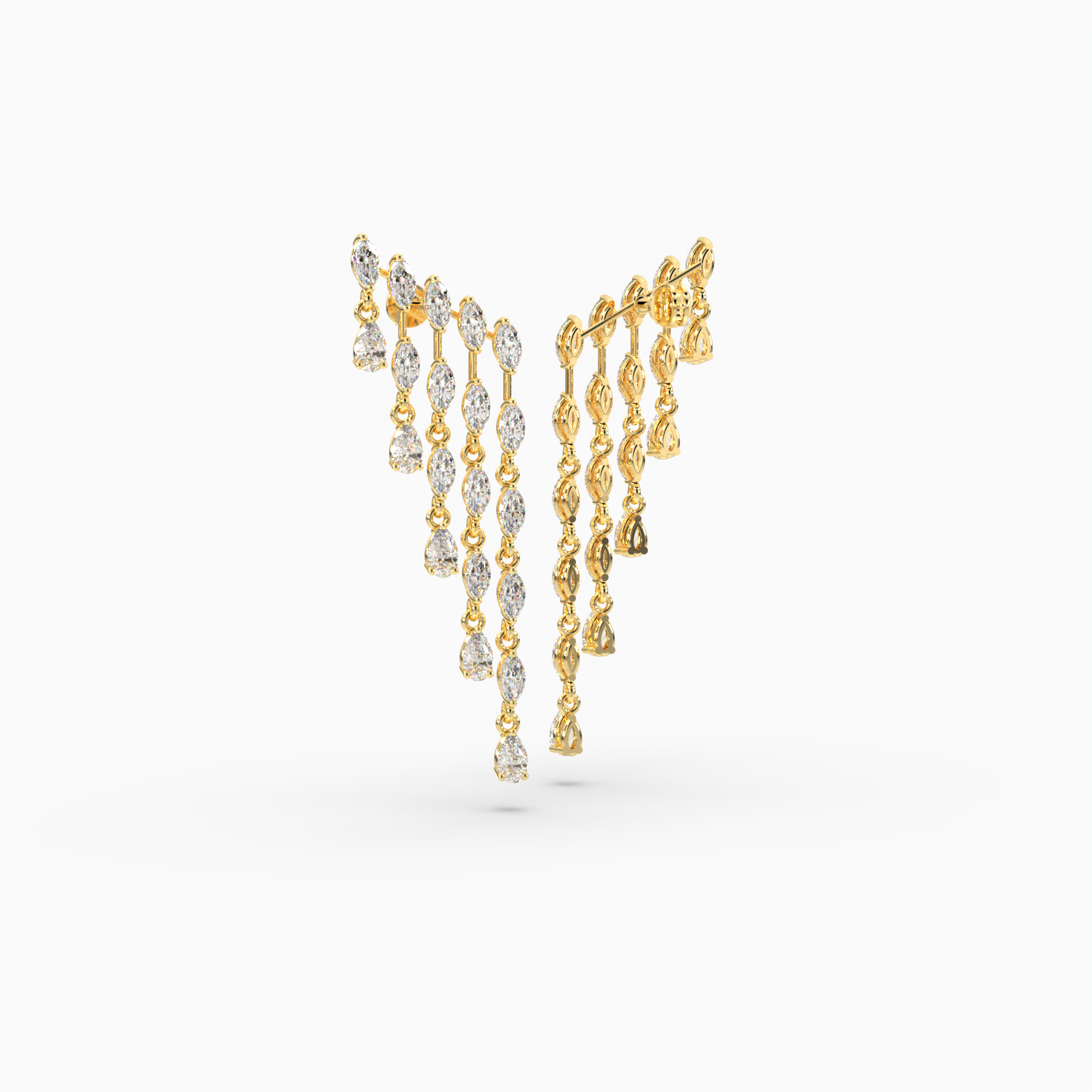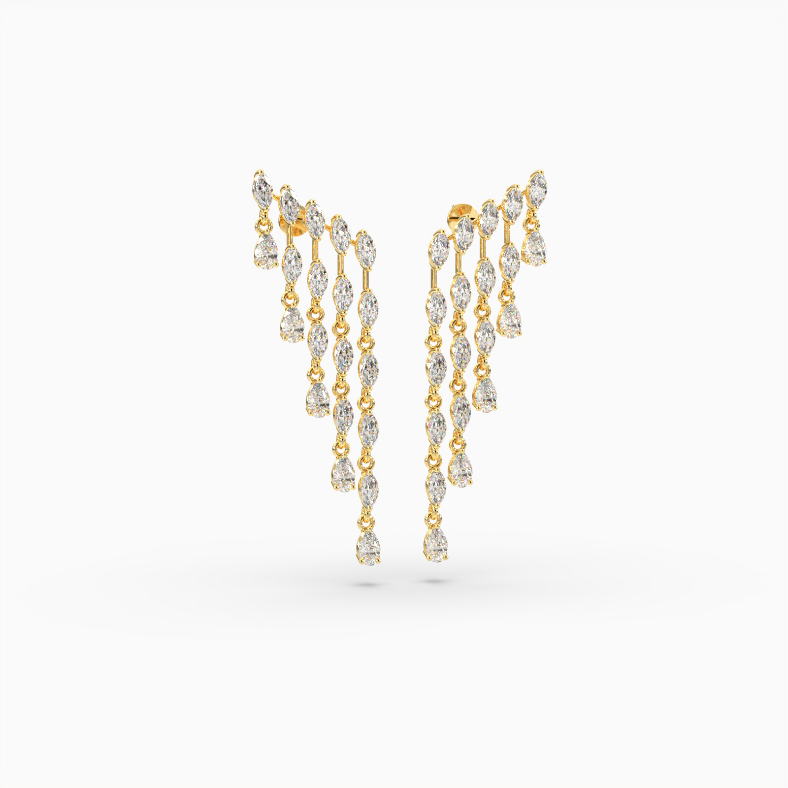 Crafted in 14kt gold, their asymmetrical silhouette creates a visual rhythm, as diamonds descend in graceful tiers, echoing the beauty of a natural waterfall. A perfect balance of structure and flow, these earrings are designed to elevate moments of significance, blending contemporary sophistication with timeless allure.