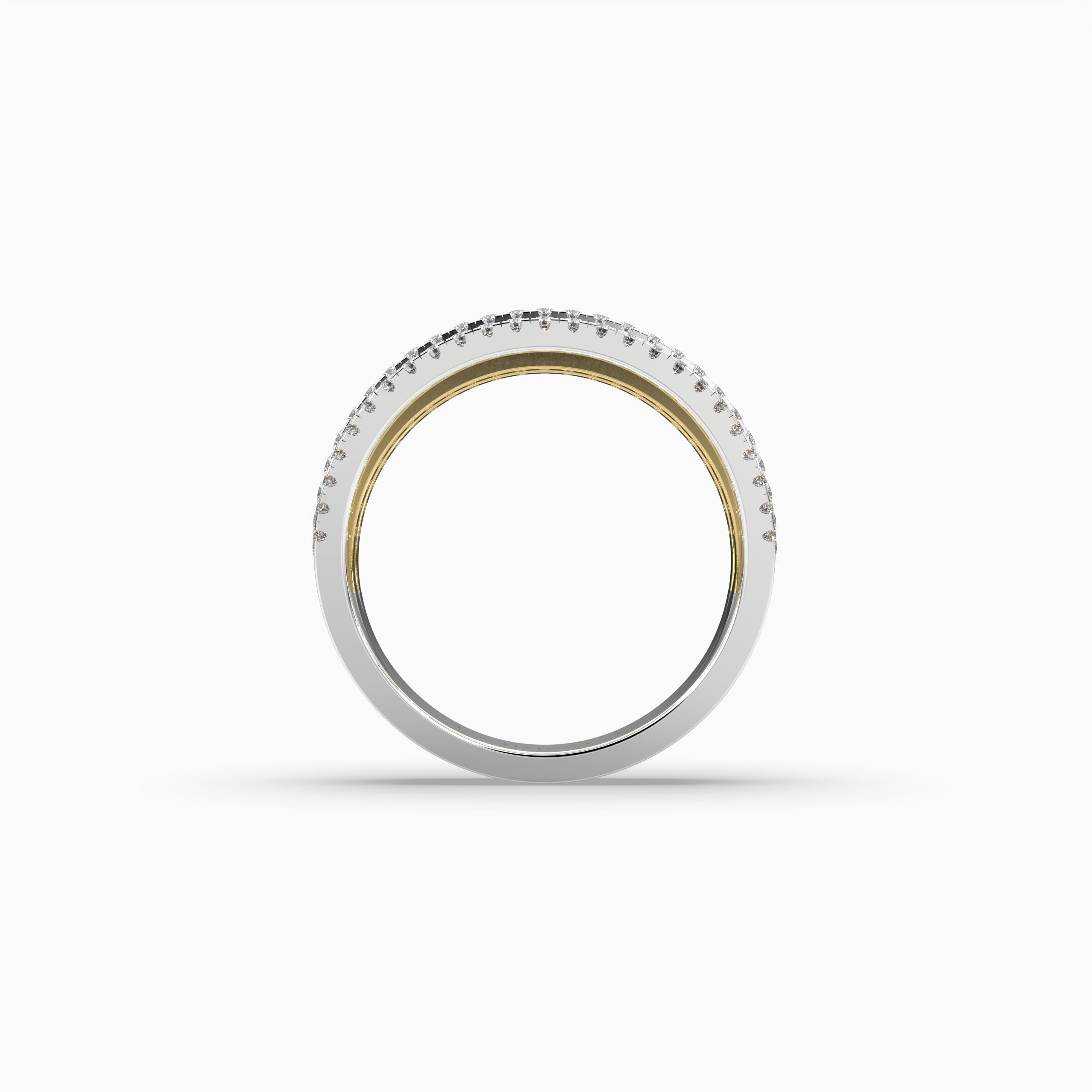 Three radiant rows of triple excellent cut diamonds, embraced by a delicate micro-prong setting, glisten like stardust against warm yellow gold accents. A mesmerizing interplay of light, elegance, and timeless romance.